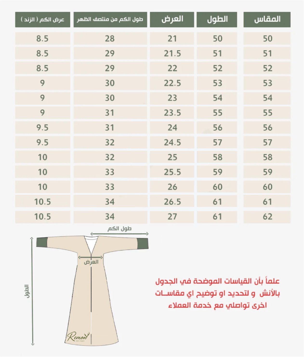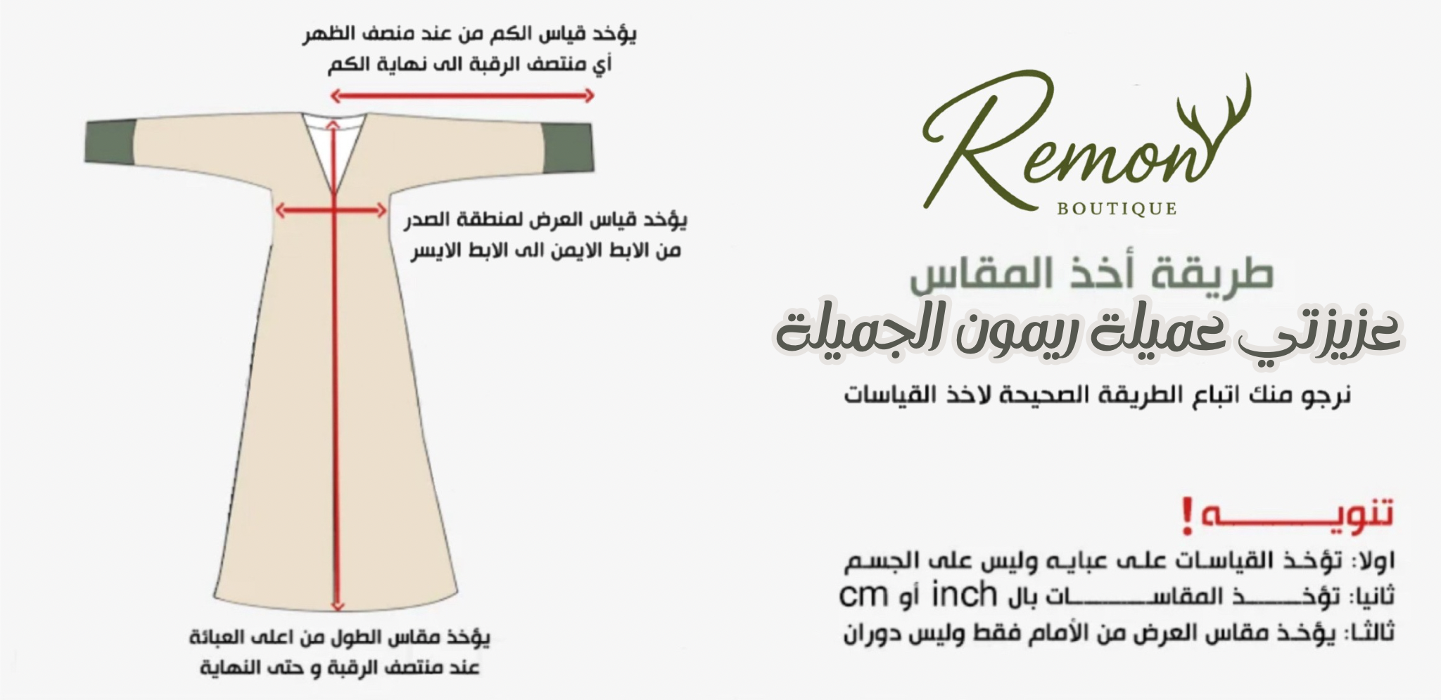 حرصاً على ظهوركِ بأجمل إطلالة، نود التنويه بأن جميع مقاساتنا تعتمد على أبعاد العباية الفعلية.